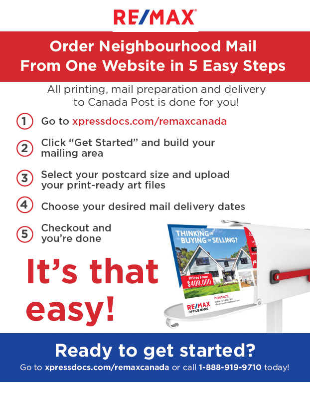 All Neighbourhood Mail printing, postal forms, mail preparation and delivery to Canada Post is done for you through Taradel, a partner of Xpressdocs a RE/MAX Approved Supplier and includes the 40% contracted postage discount with Canada Post!