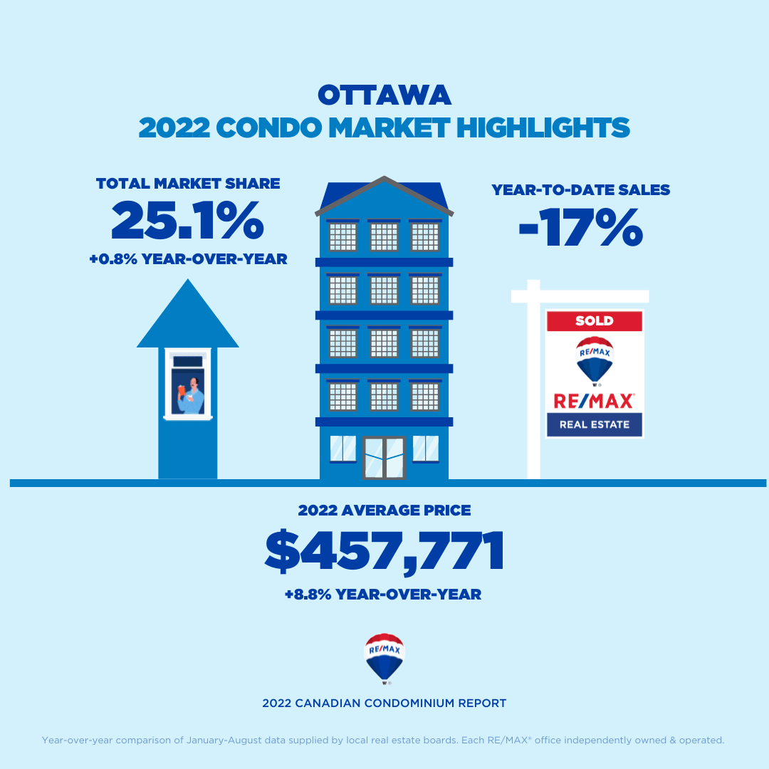 RE/MAX’s 2022 Canadian Condominium Report examined more than 120 communities in six major markets, including Greater Vancouver/Fraser Valley, Calgary, Edmonton, Greater Toronto, Ottawa and Nova Scotia. The report found that condominium sales were down in the first eight months of 2022 in four markets, including Greater Vancouver/Fraser Valley, Greater Toronto, Ottawa and Nova Scotia, while Calgary and Edmonton reported double-digit sales increases over the same period in 2021. Condo values are up in almost all markets year-over-year, with many bolstered by a robust strong first quarter.