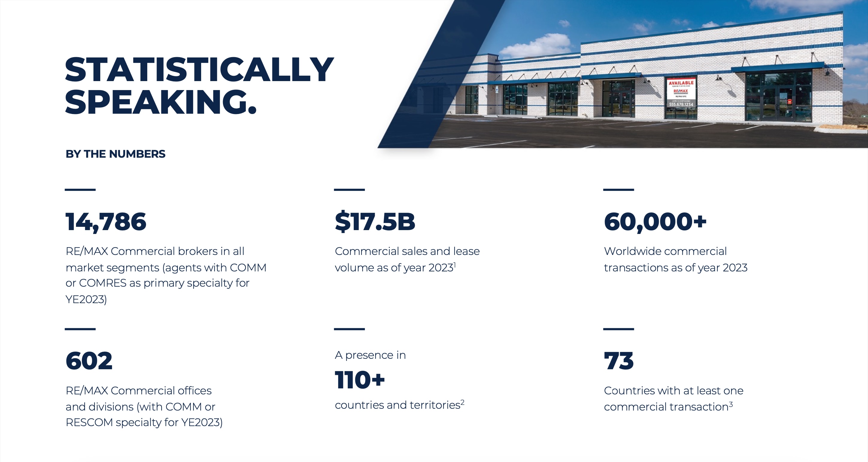 Backed by the RE/MAX® brand with over 50 years of experience, RE/MAX Commercial® continues to innovate and invest in industry-leading tools that provide you with the right resources to help your clients achieve their real estate goals.