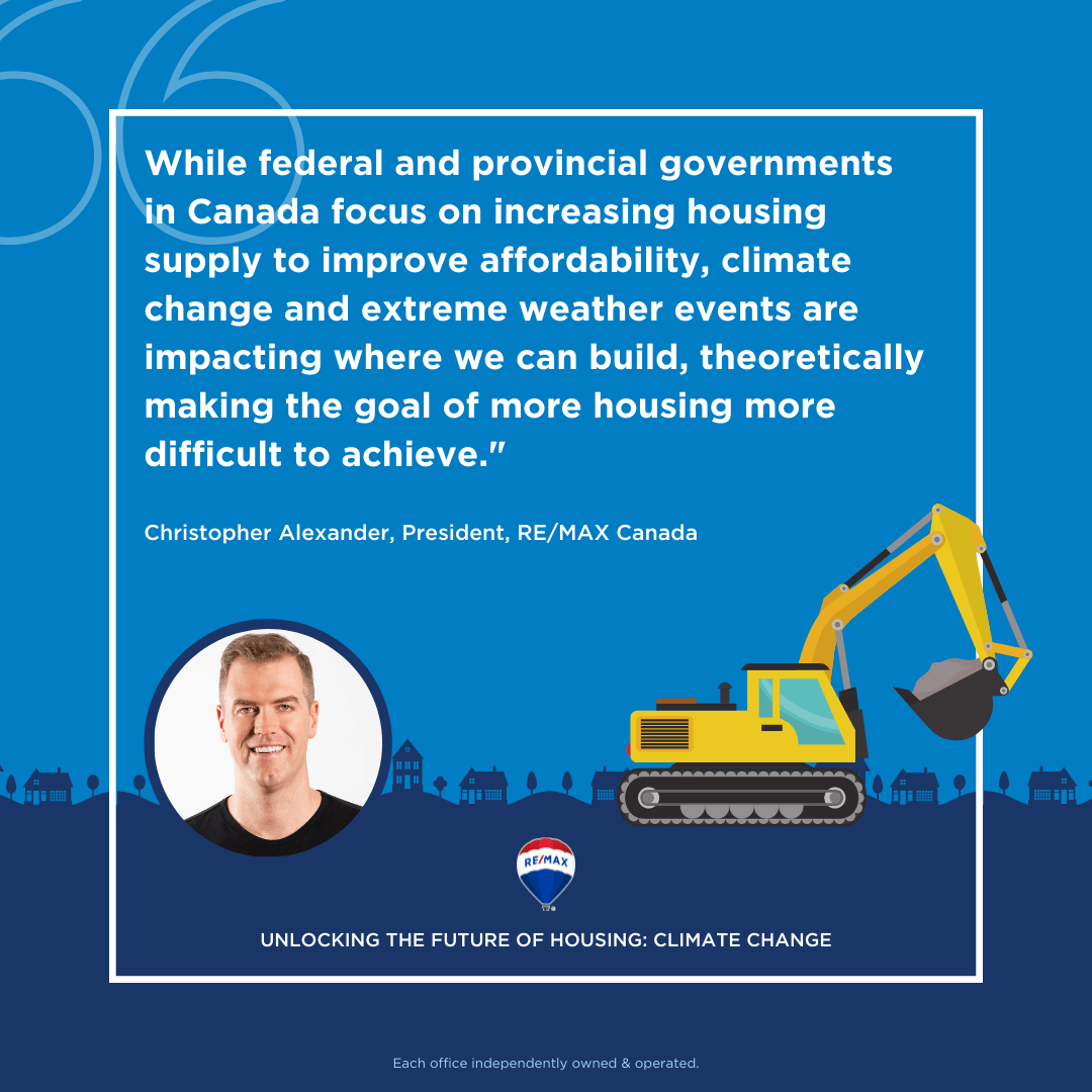 Unlocking the Future, Chapter Two found the impact of climate change on current and future homeowners is already being felt through displacement due to catastrophic events, higher insurance premiums and compromised liveability. The estimated trend of the overall costs of catastrophic losses has increased from approximately $1 billion in 2005 to almost $2.5 billion in 2021 and continues to be on an upward trajectory. With that, RE/MAX Canada collaborated with Kathryn Bakos, Director of Climate Finance and Science at the Intact Centre on Climate Adaptation and Dr. Mike Moffatt, Senior Director of Policy and Innovation at Smart Prosperity Institute, to examines climate scenarios such as floods, wildfires and severe storm events and their impact on the housing market. Chapter two concludes that both climate mitigation and adaptation measures are integral to improving housing affordability, as well as liveability, and should be integrated into a national housing strategy over the next five years.