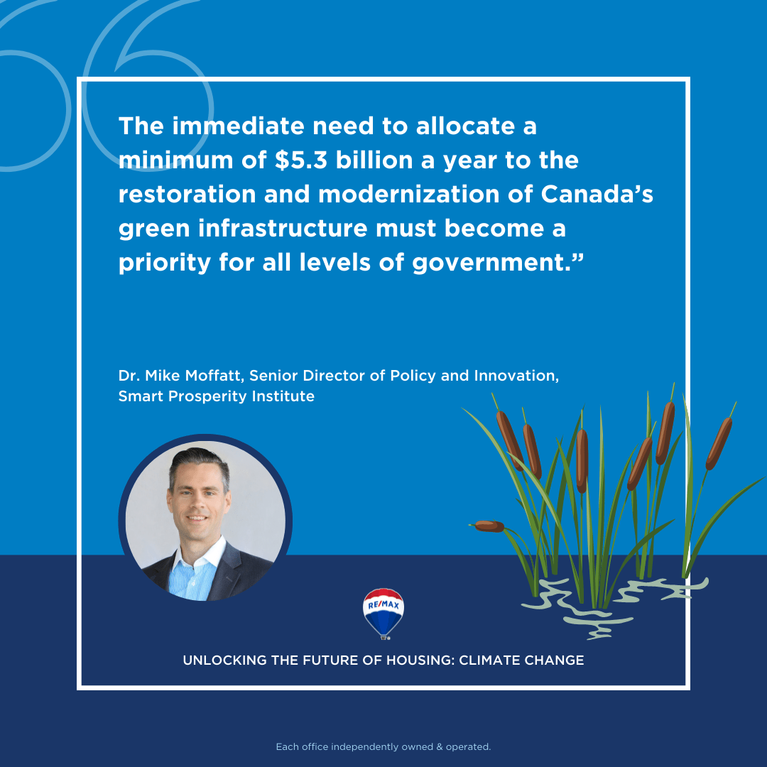 - The immediate need to fund and invest in the restoration and modernization of Canada’s green infrastructure, such as wetlands, grasslands and brown infrastructure, including sewage systems, among other initiatives, must become a priority for all levels of government.