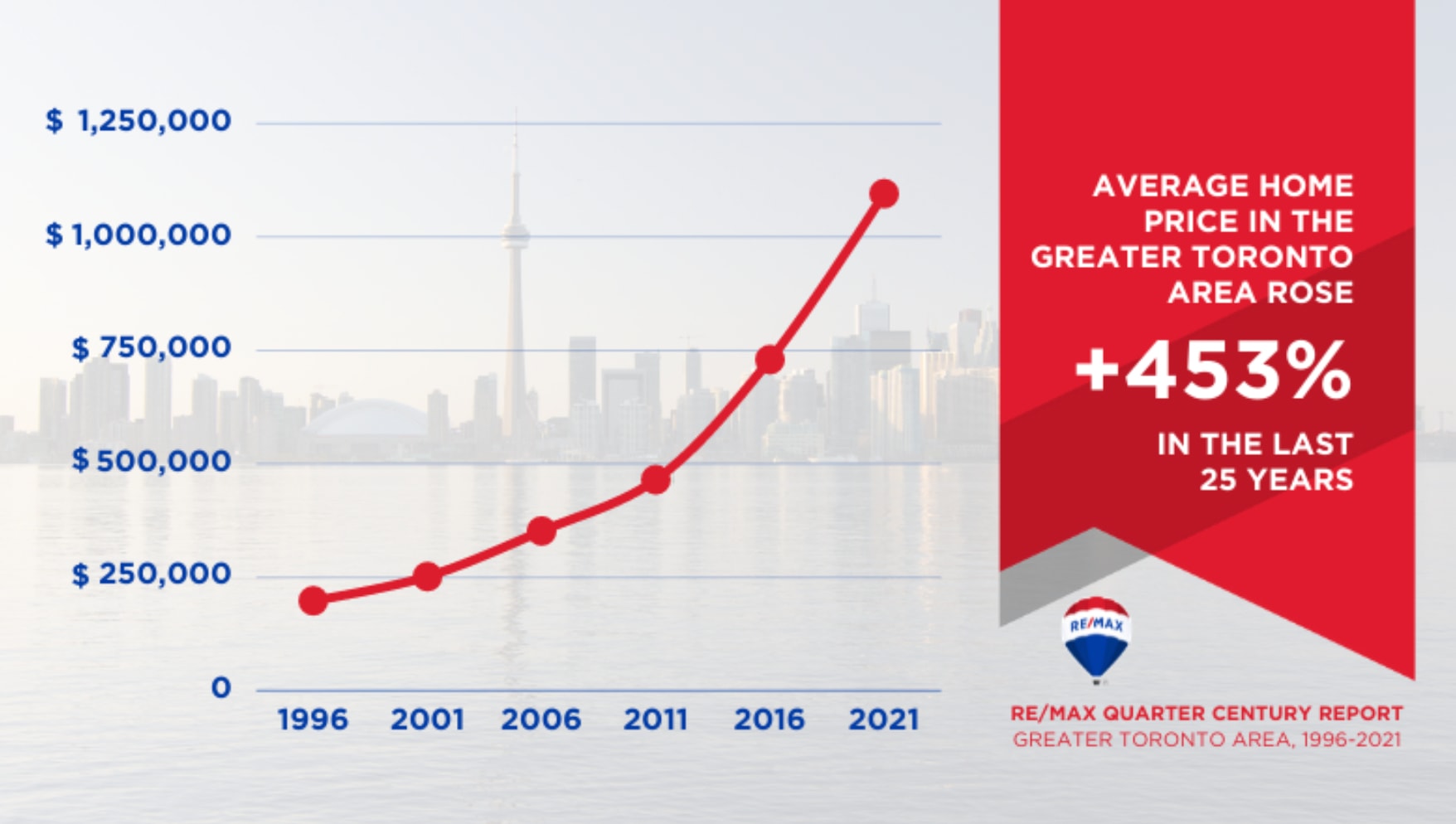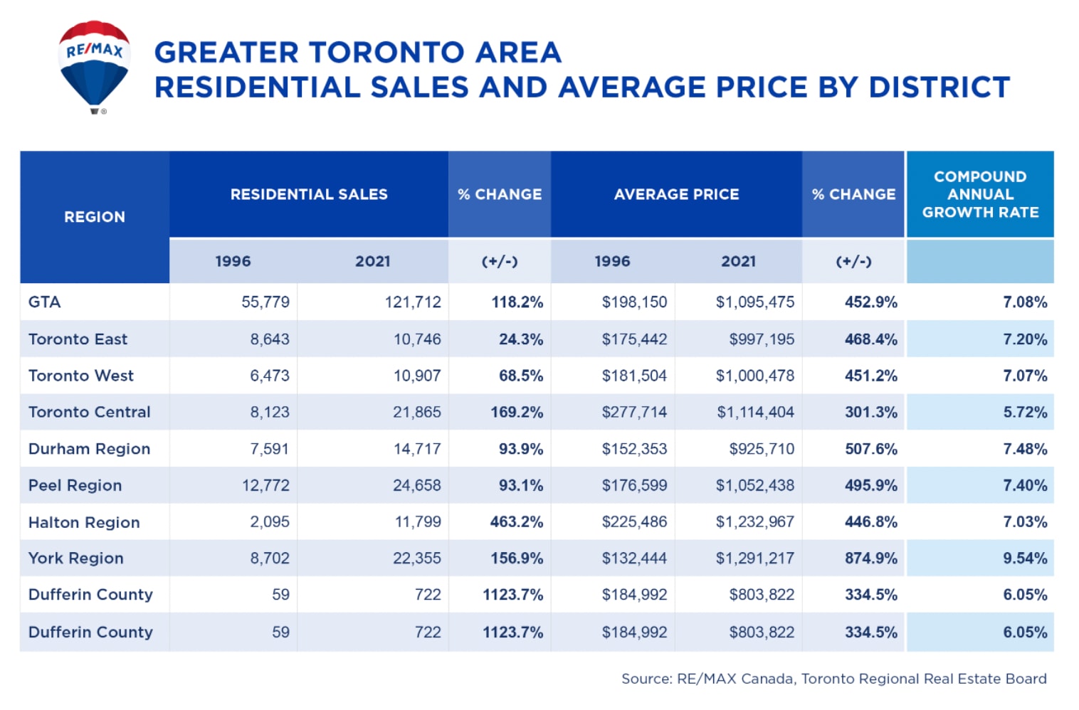 Residential unit sales in the Greater Toronto housing market have doubled and average price has increased more than 450 per cent since 1996, as strong demand and limited supply continue to drive rapid price escalation throughout the 416 and 905 area codes, according to a new report released by RE/MAX Canada.